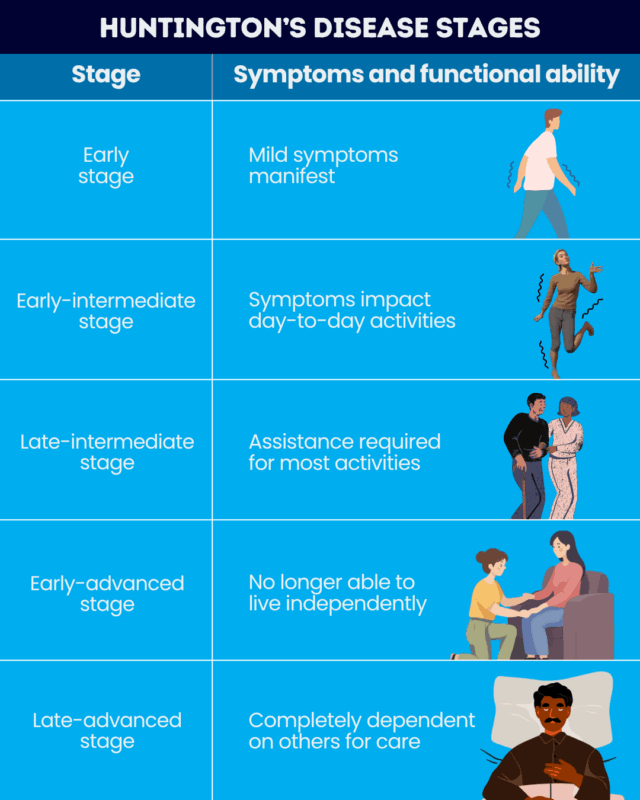 It’s important to note that Huntington’s disease progression may look different for every person with the disease, depending on factors ranging from underlying genetics to lifestyle habits.